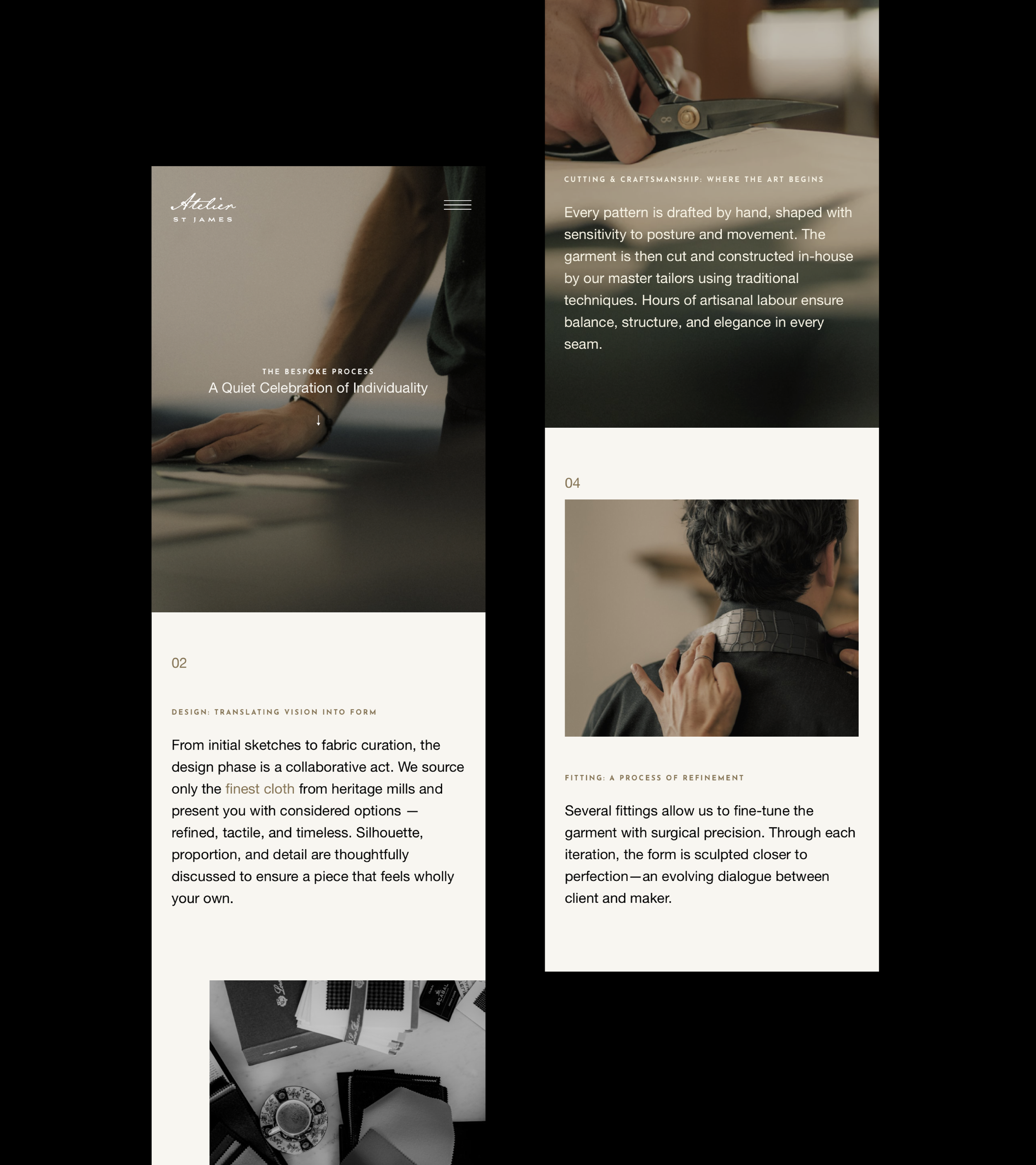 As a relatively blank canvas, the project focused on building strong commercial foundations for the next phase of the brand’s growth. Adesso Partners created a new identity and digital presence that clarify Atelier St James’ positioning—ensuring it feels confident, credible, and distinct in a competitive luxury landscape. Minimal and restrained in style, the system allows the atelier to focus attention on what matters most: the craft of bespoke tailoring, expressed through a contemporary sensibility and subtle Italian flair.